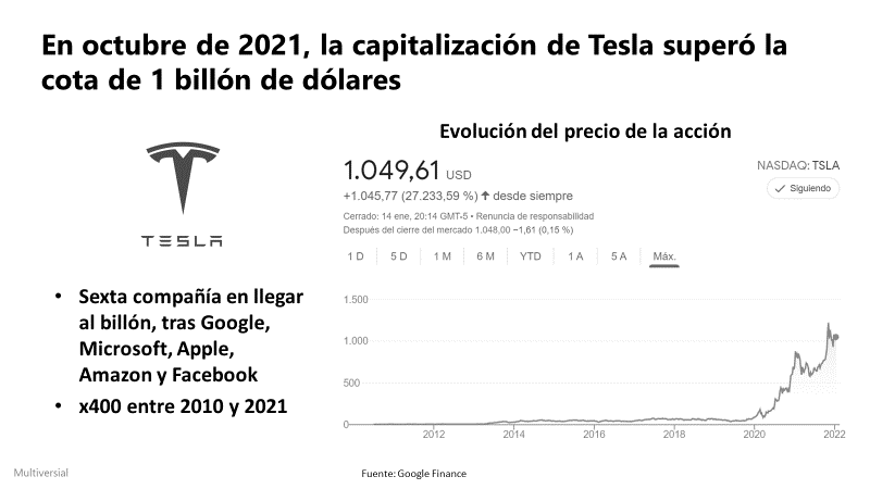 El pasado mes de octubre el precio de las acciones de Tesla superó los 1.000 dólares. Más allá de representar una cifra simbólica (que por lo demás es fácilmente manipulable por medio de splits y contrasplits) lo que realmente fue noticia ese día es que la capitalización bursátil de la compañía (esto sí tiene más sustento) superaba el billón de dólares. Por si hay alguna duda, un 1 seguido de 12 ceros, lo que los angloparlantes llaman one trillion. De esta forma entraba en un selecto club en el que sólo había otras cinco compañías: Alphabet (antes Google), Microsoft, Apple, Amazon y Facebook (ahora Meta). Además, Tesla tiene el honor de ser la segunda compañía que menos tiempo ha tardado en alcanzar esa cota, sólo por detrás de Meta.